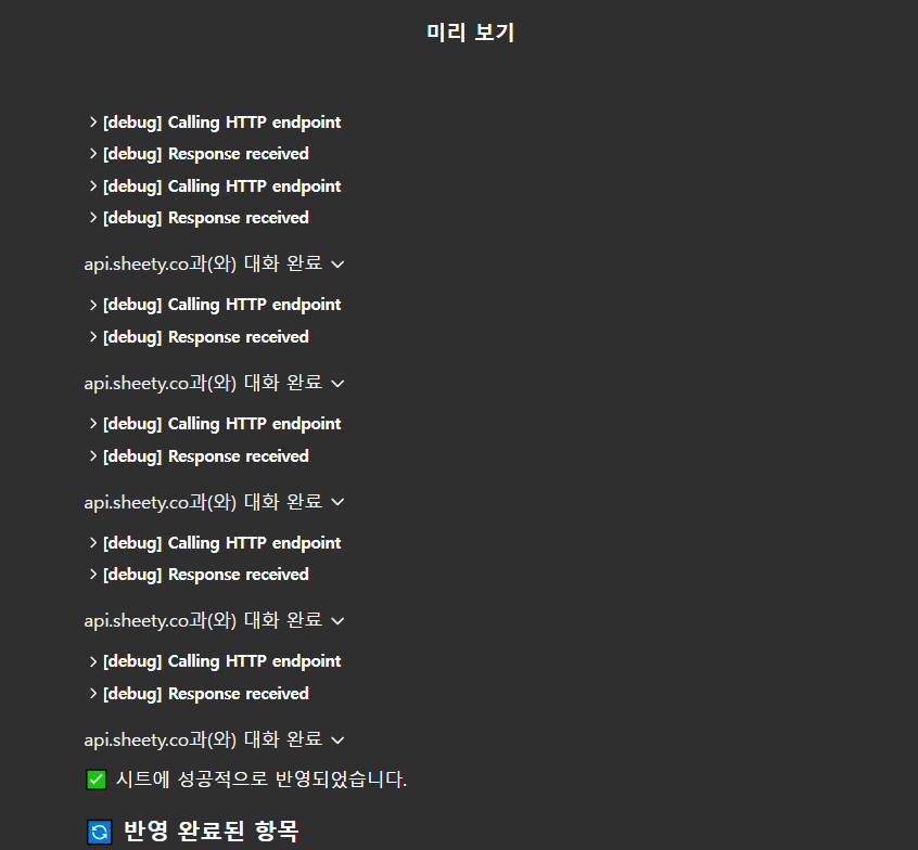 복수 건에 대해 하나식 PUT 요청을 보내면서 진행되고, 구글 시트에도 업데이트 일자가 갱신되는 것을 확인할 수 있다.