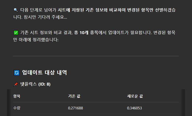 이번에는 GPT와 구글시트, Sheety API를 연동해서 이 과정을 거의 자동화할 수 있게 만들었다. 각 증권사에서 복사한 보유 종목 텍스트만 붙여넣으면, GPT가 자동으로 종목명, 수량, 매수가 등 필요한 정보만 파싱해서 정리하고, 기존 시트와 비교해 변경된 값만 업데이트할지 묻는 흐름으로 설계했다. 이미 보유 중인 종목이라면 기존 데이터를 불러와서 차이를 보여주고, 신규 종목이면 자동으로 새 행을 추가해준다. 업데이트 일자도 자동으로 기록되기 때문에 추후 변화 추적도 가능하다.