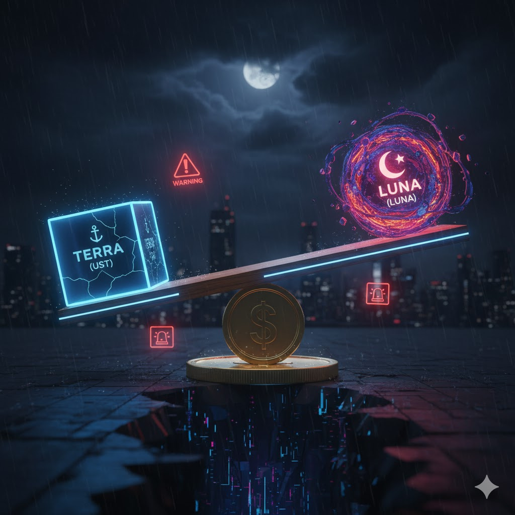테라-루나 사태는 '알고리즘 스테이블코인'이라는 시스템의 구조적 취약성이 현실화된 비극적인 사건입니다. 테라 생태계는 두 개의 코인, 즉 1달러 가치에 고정되도록 설계된 스테이블코인 테라(UST)와, 이 가치를 유지하기 위해 발행량이 조절되는 자매 코인 루나(LUNA)로 이루어져 있었습니다. 투자자들은 UST를 예치하면 연 20%에 가까운 파격적인 이자를 주는 '앵커 프로토콜'에 열광했고, 이는 UST 수요를 폭발적으로 증가시키는 동력이 되었습니다.